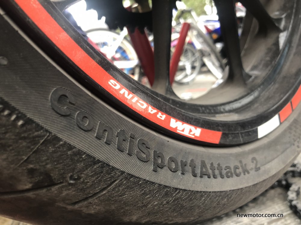 话题回到换胎过程,我的DUKE 200的原厂轮胎是ContiSportAttack2,即马牌竞技2:前轮110/70 ZR 17 后轮150/60 ZR 17 ,这款胎好不好?答案是:很好,国内外车友都公认的好胎,抓地优秀,弯道循迹性优秀,同时竞技胎可以给你最大的操控极限,缺点也很明显,作为一款竞技胎,始终逃不了磨损过快的缺点。