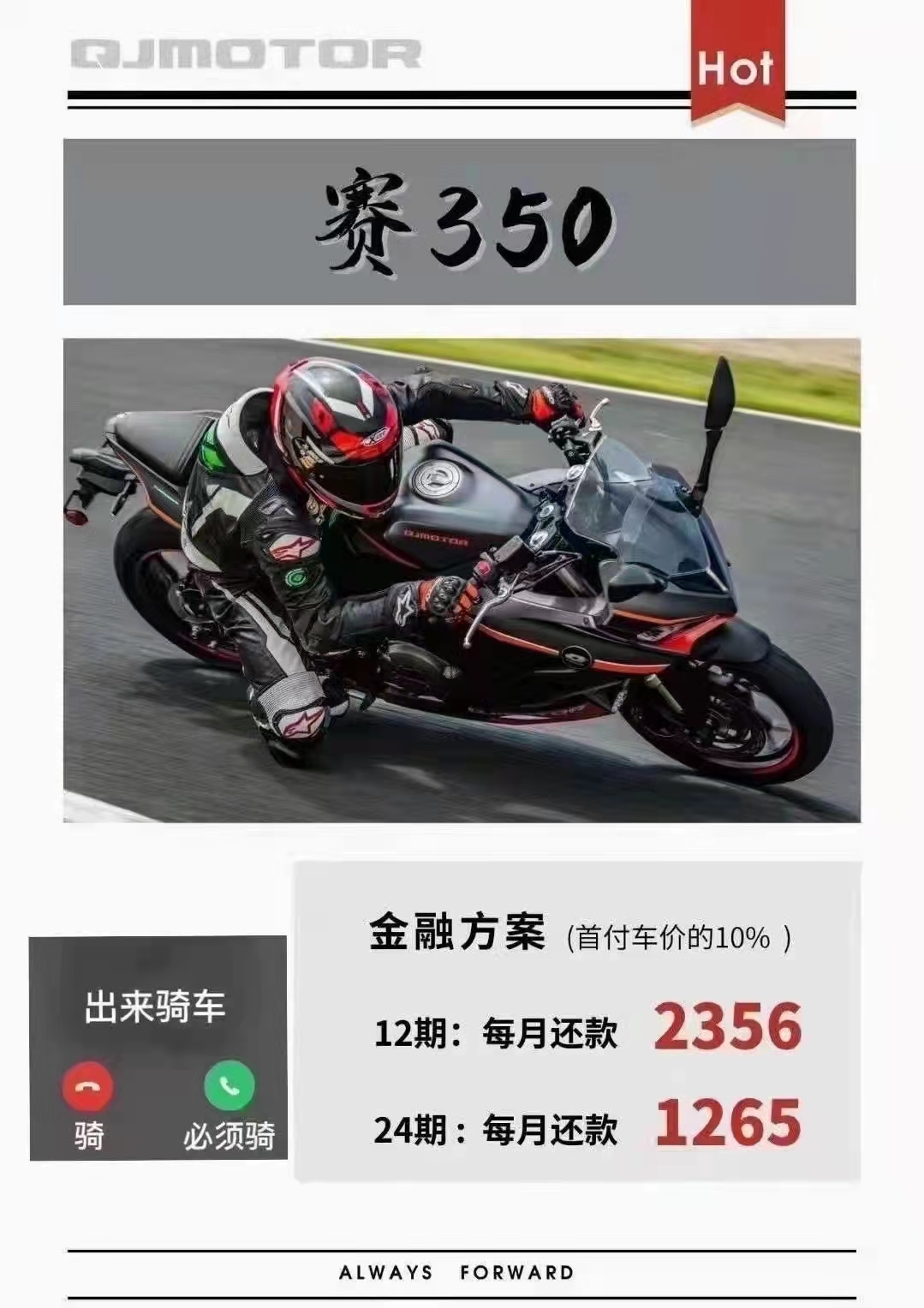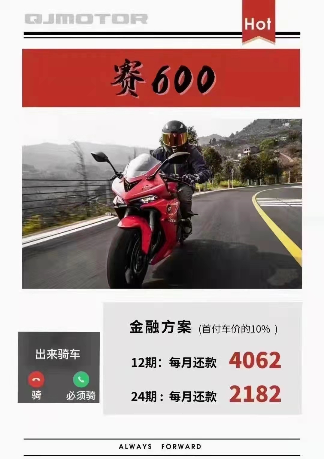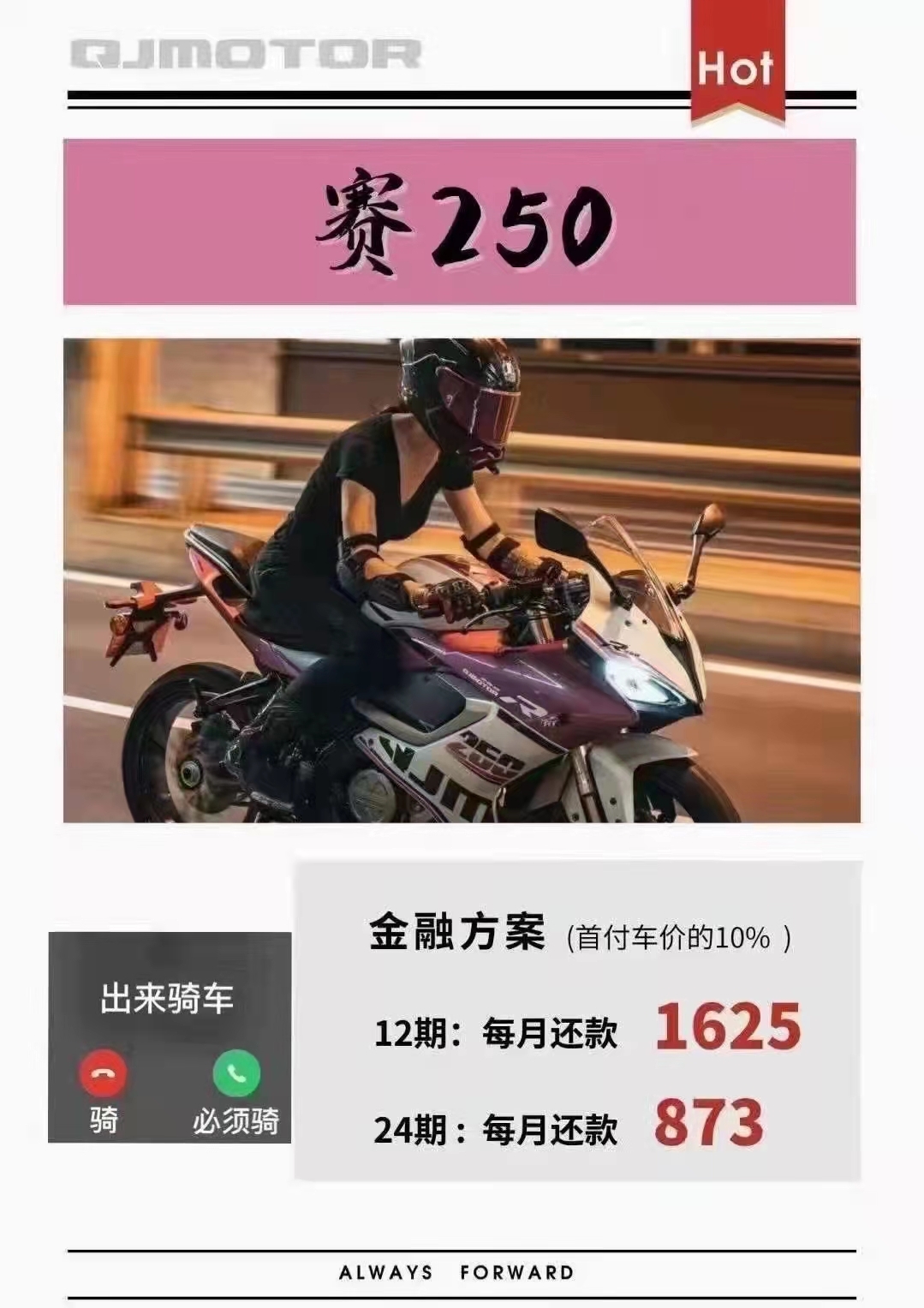 赛250厂家金融免息分期 QJMOTOR全系250及以上排量车型,均可办理厂家金融分期,最低0首付,最长24期。高通过率,低利率; 赛250、赛350、赛600、追600、骁750公路版更可在QJMOTR重庆店(渝北区兰馨大道109号附5号)办理12期免息分期。 还没购买赛250的准车主们,赶紧到店下单吧! 详情咨询电微18983638882