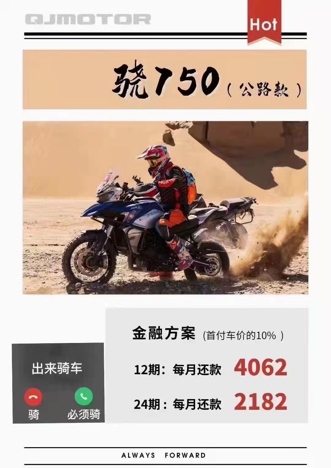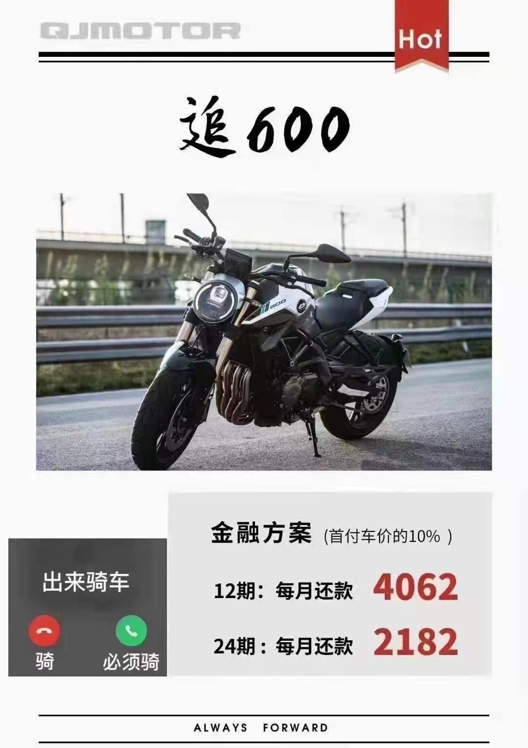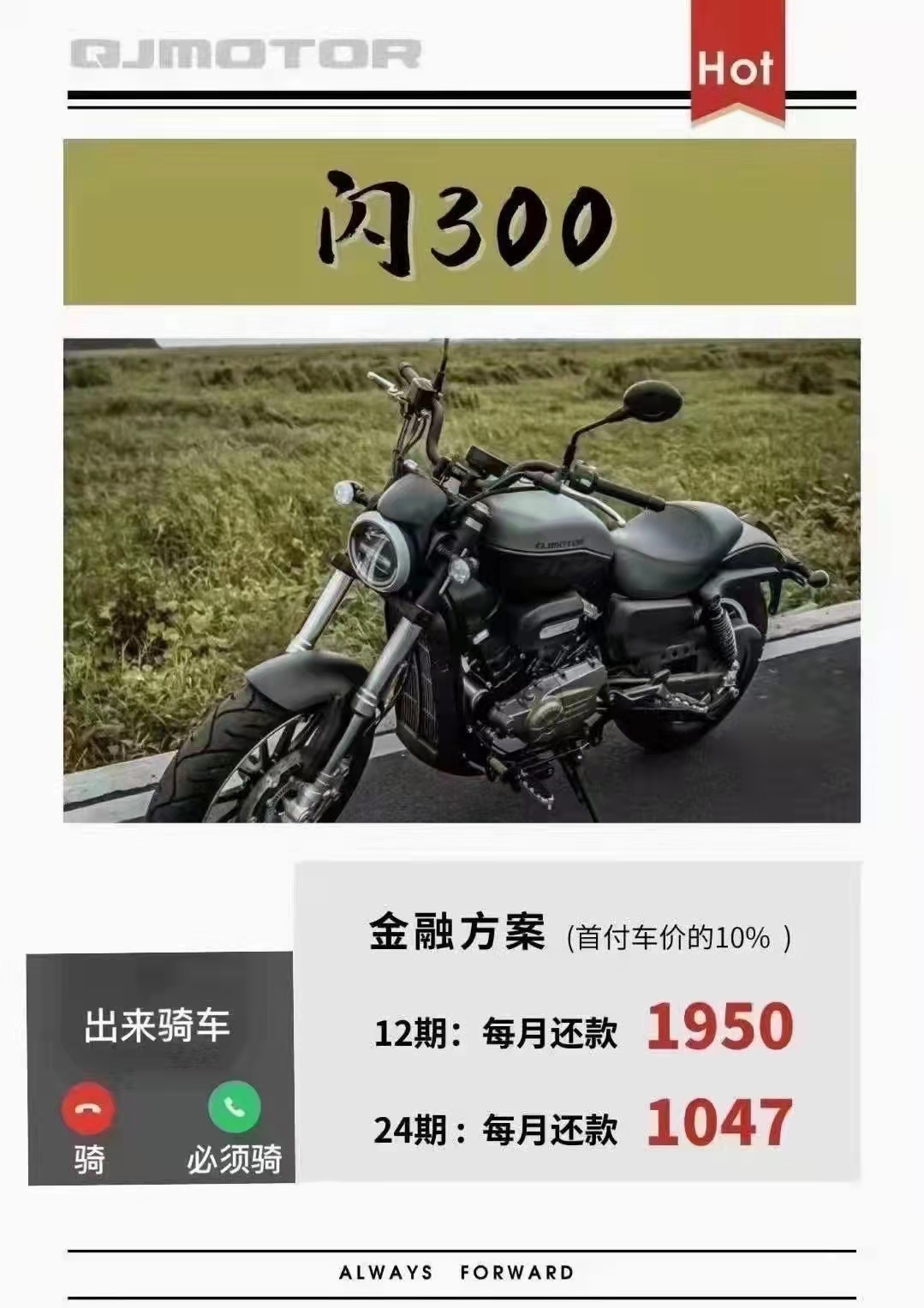 赛250厂家金融免息分期 QJMOTOR全系250及以上排量车型,均可办理厂家金融分期,最低0首付,最长24期。高通过率,低利率; 赛250、赛350、赛600、追600、骁750公路版更可在QJMOTR重庆店(渝北区兰馨大道109号附5号)办理12期免息分期。 还没购买赛250的准车主们,赶紧到店下单吧! 详情咨询电微18983638882